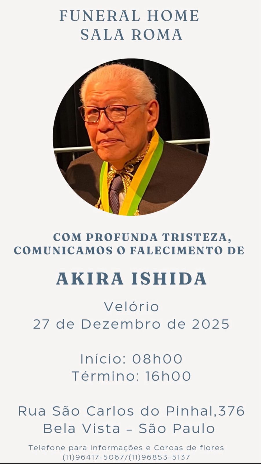 27/12/2025 Nota de falecimento Compartilhe EmailTwitterFacebookGoogle +PinterestTumblrLinkedinVkontakte E com grande pesar que comunicamos o falecimento de nosso Prof. Dr. Akira Ishida. 27/12/2025